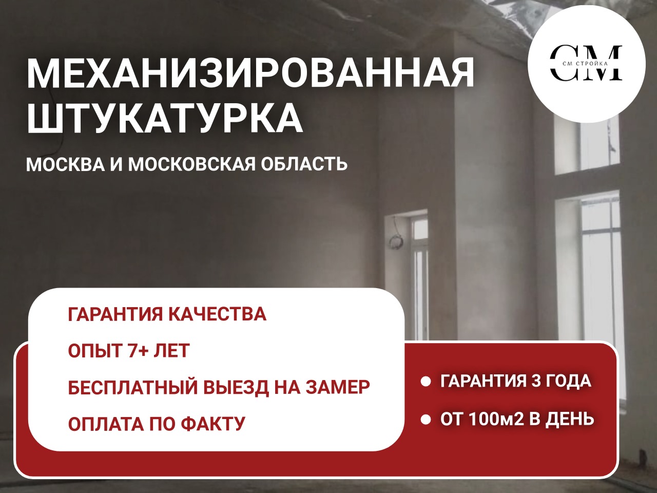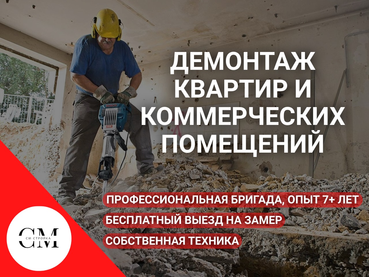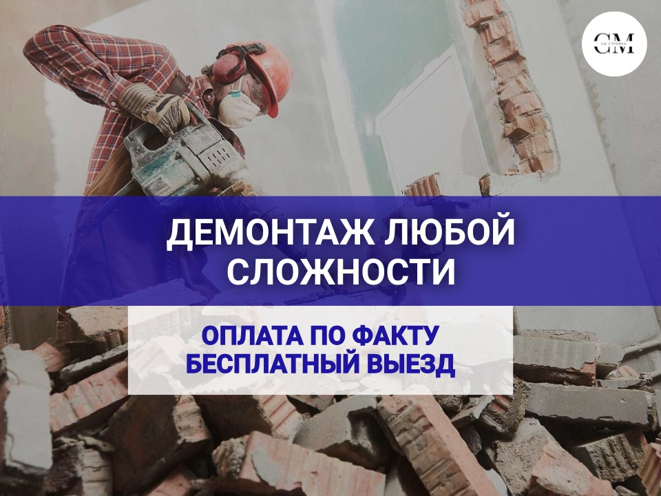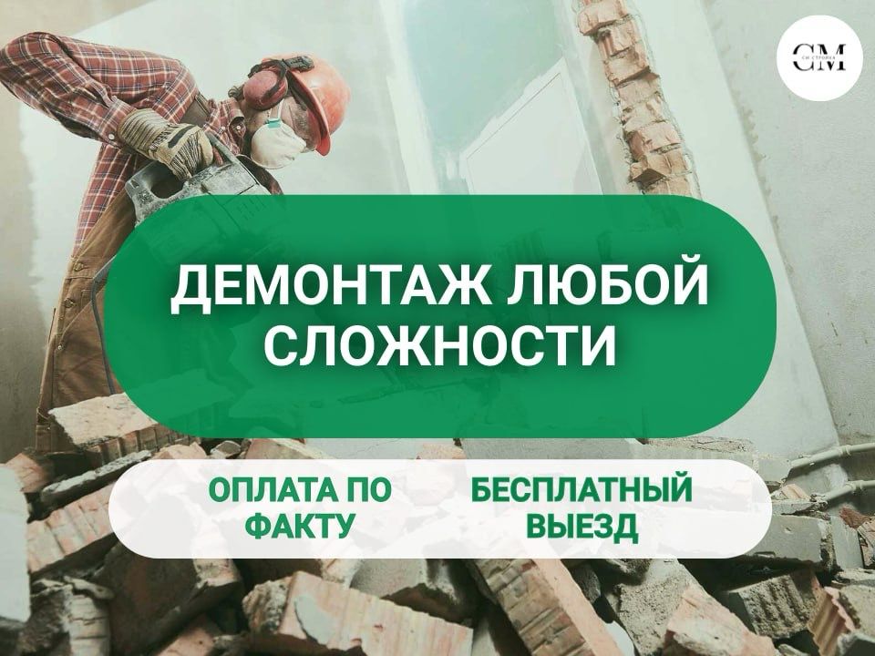 ООО СМ Стройка ДЕМОНТАЖ ДИЗАЙН РЕМОНТ жилых и коммерческих помещений в Москве и Московской области. С более чем 20-летним опытом работы, мы предлагаем высококачественные услуги, которые обеспечат быстрый и безопасный РЕМОНТ любых объектов. 🛠️ Наши услуги включают: Демонтаж помещений и их ремонт под ключ: Быстро и аккуратно освободим ваше жилое пространство от старых конструкций и отделочных материалов и закончим ремонт в срок 🏠. Демонтаж коммерческих помещений и их ремонт: Профессионально подготовим ваше помещение для нового ремонта или перепланировки. 🏢. Дизайн проект подготовим в короткие сроки. Механизированная штукатурка: Используем современные технологии для нанесения штукатурки, что позволяет добиться идеально ровных поверхностей и значительно сократить сроки выполнения работ. 🏗️. 🌟 Почему выбирают нас? Опыт и профессионализм: Более 20 лет на рынке — это гарантия качества и надежности. 🏅. Современное оборудование: Мы используем передовые технологии для выполнения работ любой сложности. 🔧. Индивидуальный подход: Учитываем все пожелания клиентов и предлагаем оптимальные решения для каждого проекта. 🤝. Обращайтесь к нам для получения бесплатной консультации и расчета стоимости услуг. Мы готовы помочь вам создать идеальное пространство для жизни и работы! 🌟Выполняемые работы