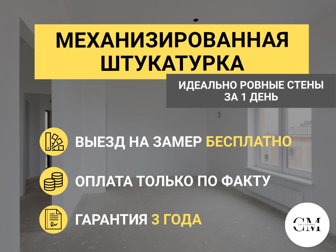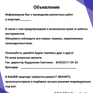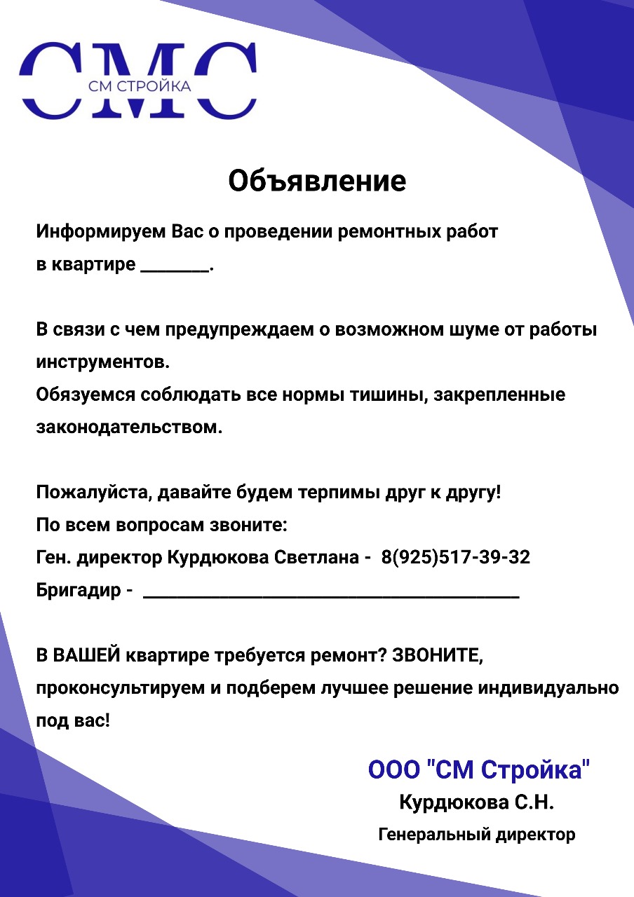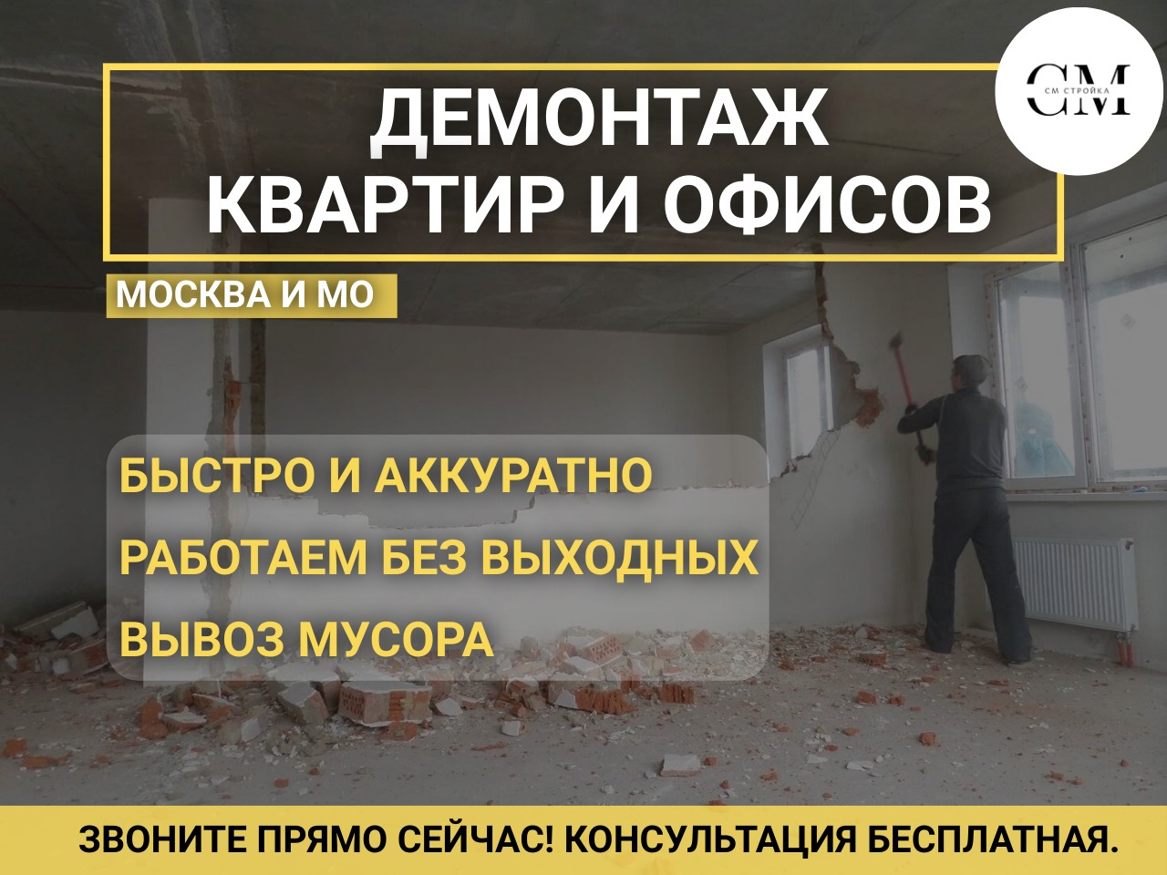 ООО СМ Стройка ДЕМОНТАЖ ДИЗАЙН РЕМОНТ жилых и коммерческих помещений в Москве и Московской области. С более чем 20-летним опытом работы, мы предлагаем высококачественные услуги, которые обеспечат быстрый и безопасный РЕМОНТ любых объектов. 🛠️ Наши услуги включают: Демонтаж помещений и их ремонт под ключ: Быстро и аккуратно освободим ваше жилое пространство от старых конструкций и отделочных материалов и закончим ремонт в срок 🏠. Демонтаж коммерческих помещений и их ремонт: Профессионально подготовим ваше помещение для нового ремонта или перепланировки. 🏢. Дизайн проект подготовим в короткие сроки. Механизированная штукатурка: Используем современные технологии для нанесения штукатурки, что позволяет добиться идеально ровных поверхностей и значительно сократить сроки выполнения работ. 🏗️. 🌟 Почему выбирают нас? Опыт и профессионализм: Более 20 лет на рынке — это гарантия качества и надежности. 🏅. Современное оборудование: Мы используем передовые технологии для выполнения работ любой сложности. 🔧. Индивидуальный подход: Учитываем все пожелания клиентов и предлагаем оптимальные решения для каждого проекта. 🤝. Обращайтесь к нам для получения бесплатной консультации и расчета стоимости услуг. Мы готовы помочь вам создать идеальное пространство для жизни и работы! 🌟Выполняемые работы